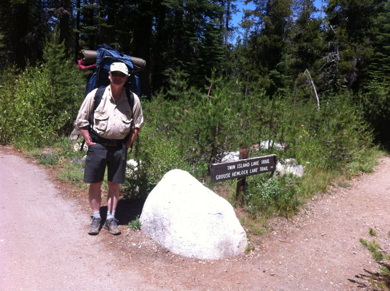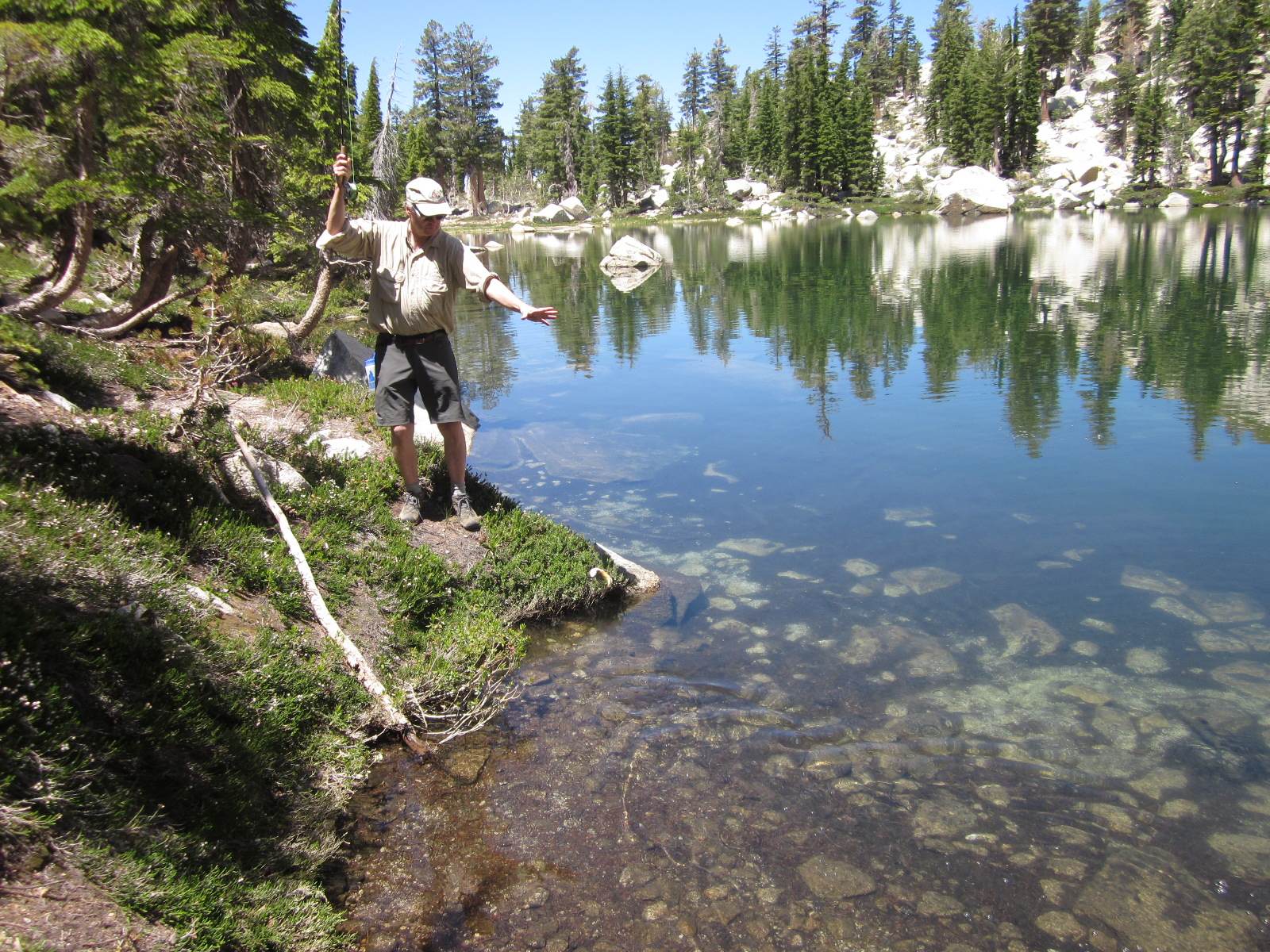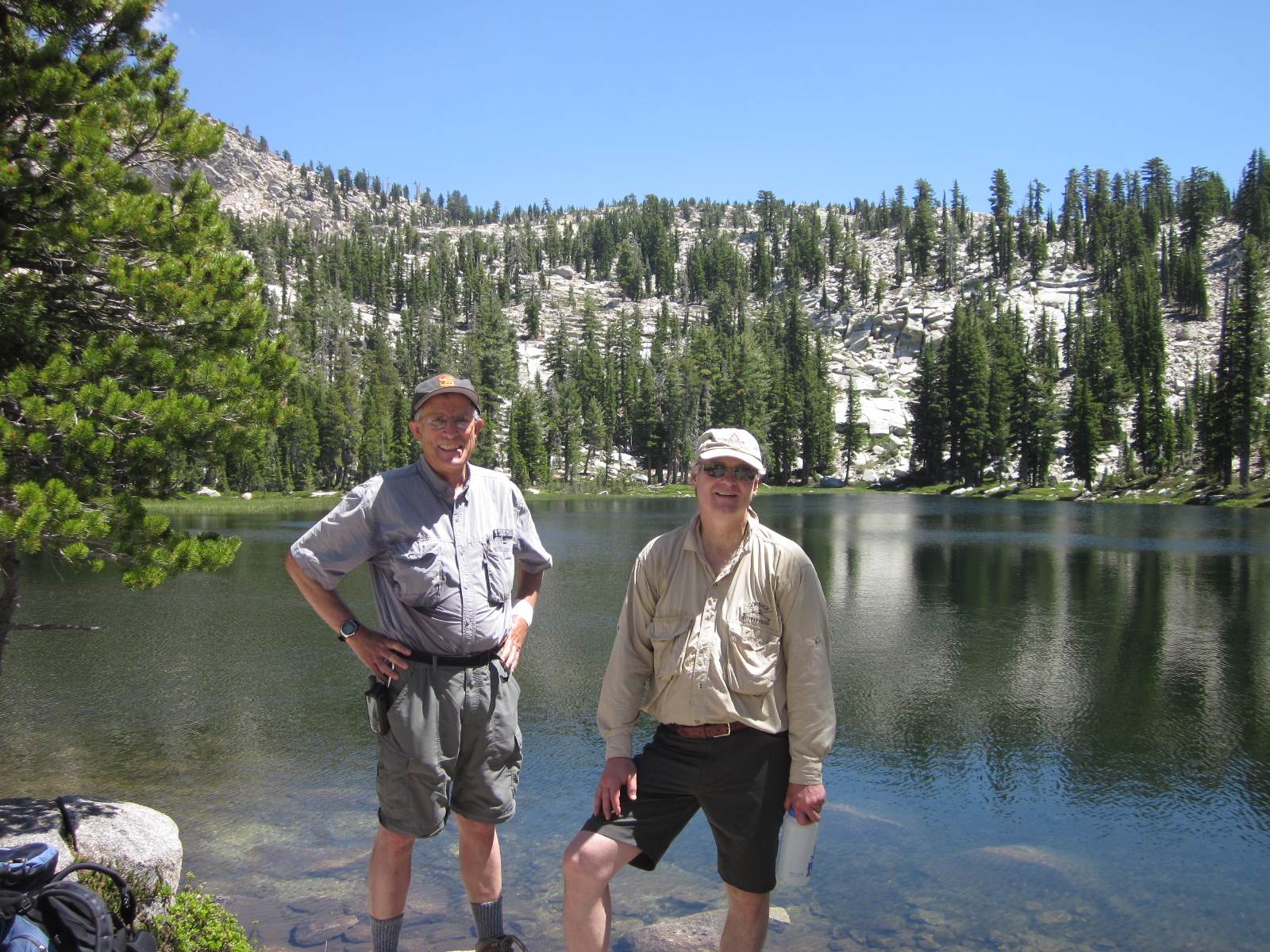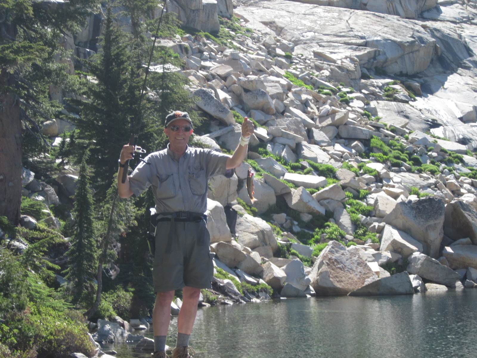 Ray and I just returned from a very enjoyable backpacking trip. We started at Wright’s Lake (el. 7000), about 15 miles north of Highway 50 near the crest of the Sierras, and then hiked east into the Desolation Wilderness. We camped at Grouse Lake (el. 8200), which is one of the loveliest lakes in the Sierras. The next day we hiked further up the trail to Smith Lake (el. 8800), which is not only strikingly beautiful but also featured fantastic fishing — Ray caught 15 fish and I caught 10, in just an hour or two of fishing. We then hiked down to Hemlock Lake (el. 8400), then back to camp, then about five miles away to Twin Lakes (el. 8000), then returned to Grouse Lake, fishing along the way. The next day we even did some geocaching, near Beauty Lake (el. 7000). All in all, it was a very enjoyable trip (if you don’t mind carrying a 50-pound backpack 1200 ft straight up)…