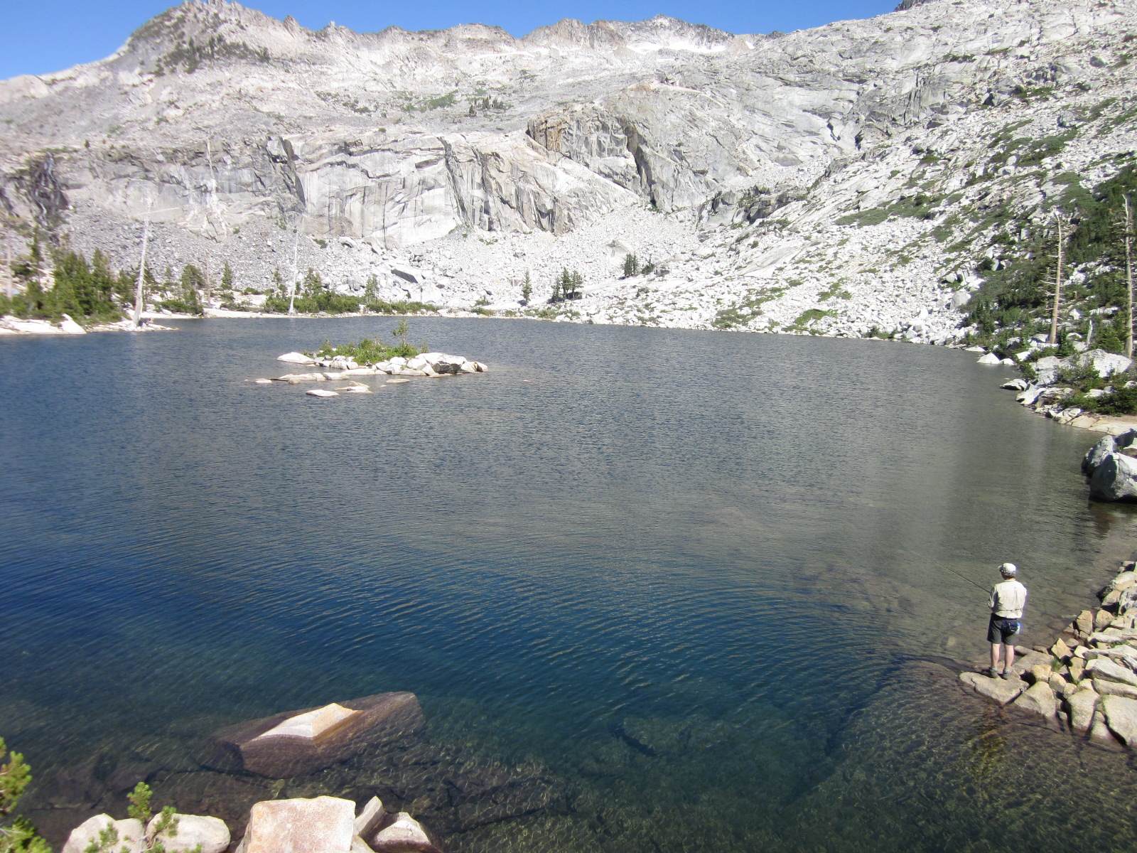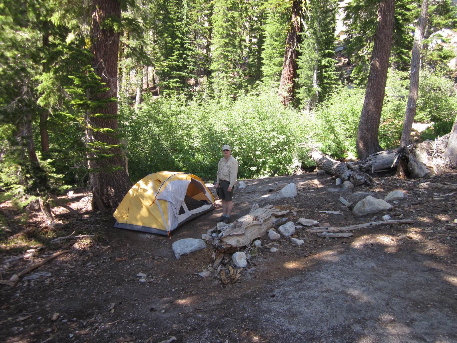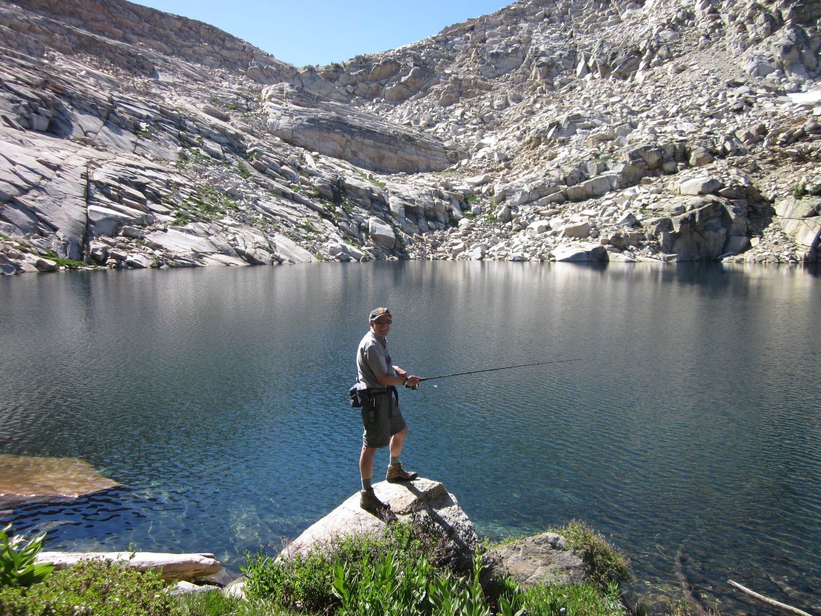 Ray and I just returned from a very enjoyable backpacking trip. We started at Wright’s Lake (el. 7000), about 15 miles north of Highway 50 near the crest of the Sierras, and then hiked east into the Desolation Wilderness. We camped at Grouse Lake (el. 8200), which is one of the loveliest lakes in the Sierras. The next day we hiked further up the trail to Smith Lake (el. 8800), which is not only strikingly beautiful but also featured fantastic fishing — Ray caught 15 fish and I caught 10, in just an hour or two of fishing. We then hiked down to Hemlock Lake (el. 8400), then back to camp, then about five miles away to Twin Lakes (el. 8000), then returned to Grouse Lake, fishing along the way. The next day we even did some geocaching, near Beauty Lake (el. 7000). All in all, it was a very enjoyable trip (if you don’t mind carrying a 50-pound backpack 1200 ft straight up)…