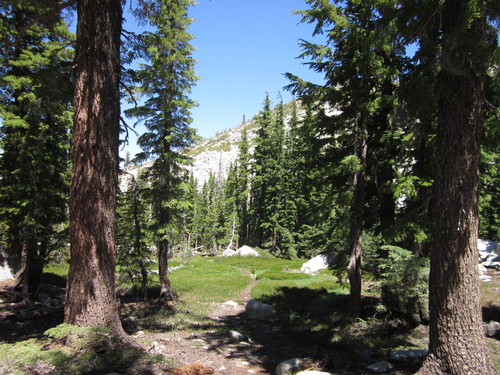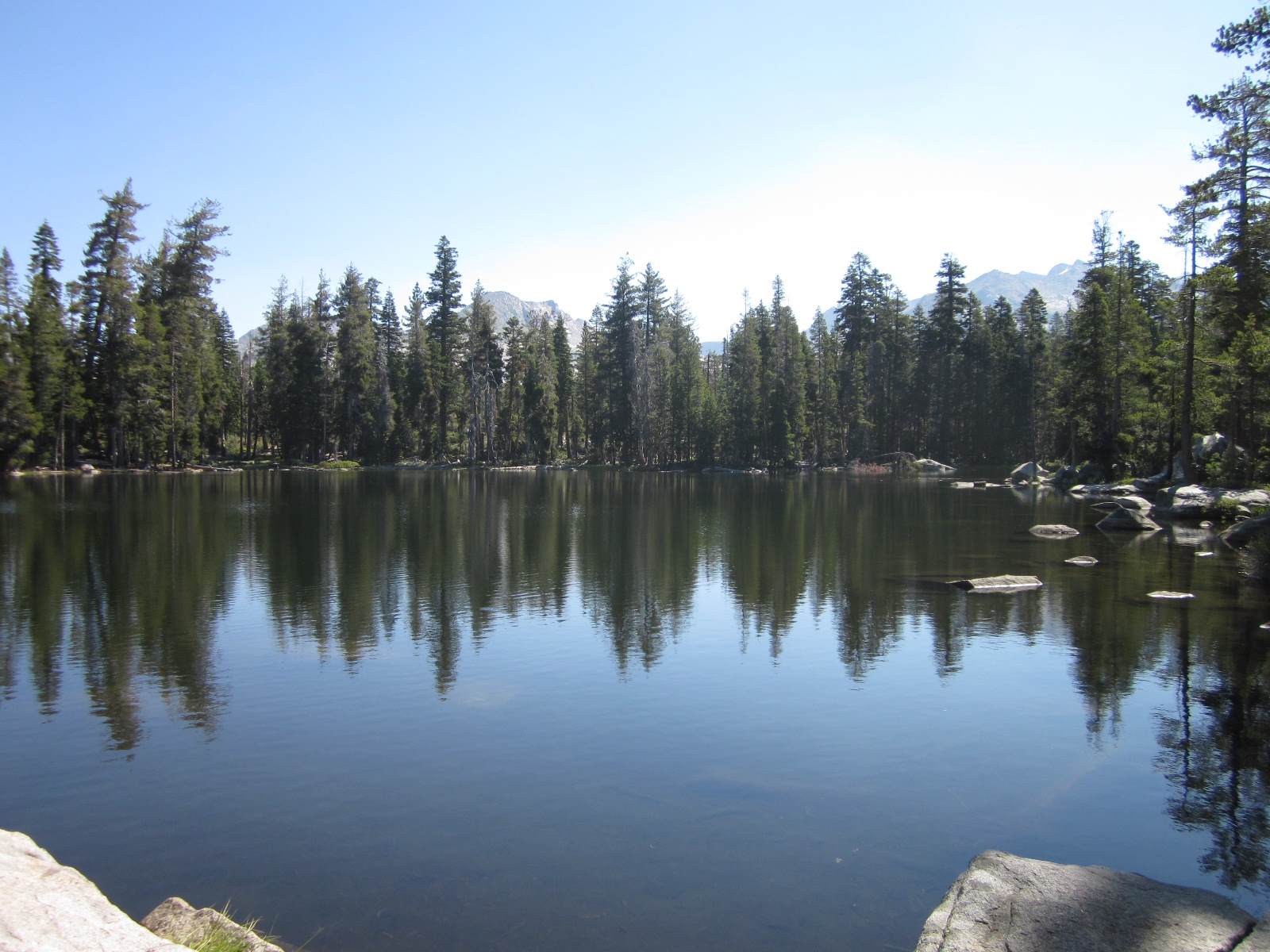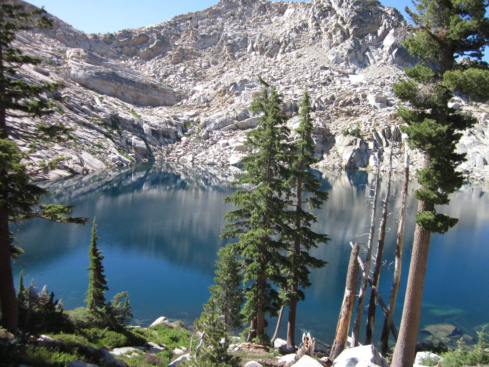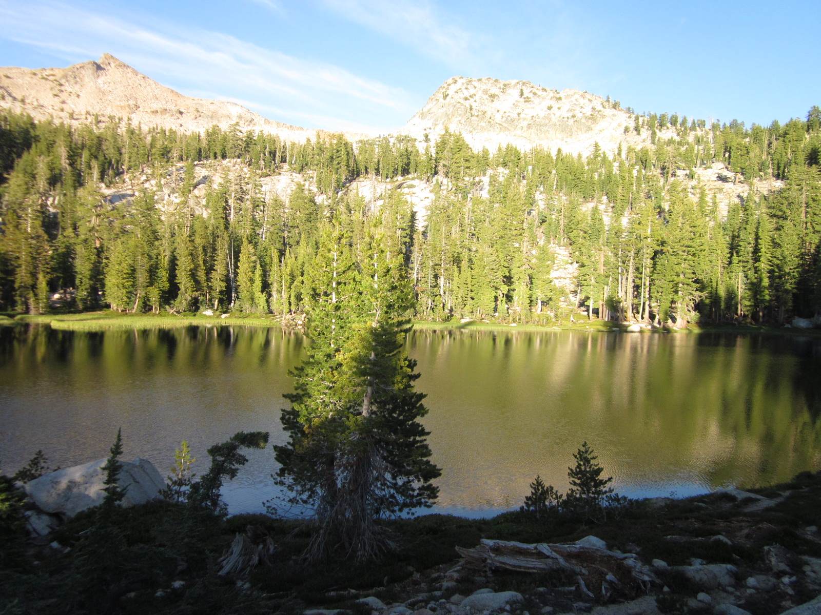 Ray and I just returned from a very enjoyable backpacking trip. We started at Wright’s Lake (el. 7000), about 15 miles north of Highway 50 near the crest of the Sierras, and then hiked east into the Desolation Wilderness. We camped at Grouse Lake (el. 8200), which is one of the loveliest lakes in the Sierras. The next day we hiked further up the trail to Smith Lake (el. 8800), which is not only strikingly beautiful but also featured fantastic fishing — Ray caught 15 fish and I caught 10, in just an hour or two of fishing. We then hiked down to Hemlock Lake (el. 8400), then back to camp, then about five miles away to Twin Lakes (el. 8000), then returned to Grouse Lake, fishing along the way. The next day we even did some geocaching, near Beauty Lake (el. 7000). All in all, it was a very enjoyable trip (if you don’t mind carrying a 50-pound backpack 1200 ft straight up)…