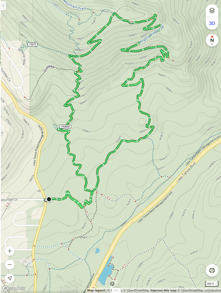 Here is a map of a hike from the Tahoe Mountain Road trailhead, including the loop described above: