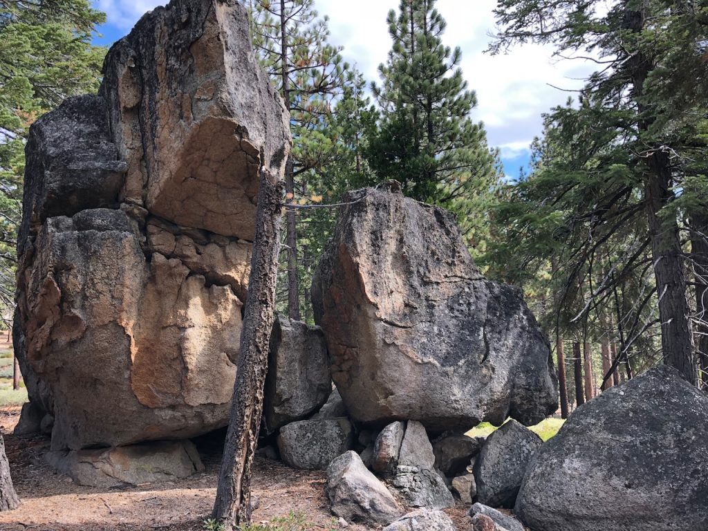 The Angora Ridge Trail is one of the most easily accessible trails in the South Tahoe area — only about two miles southwest of the “Y” intersection in South Lake Tahoe. The full round trip hiking distance is only 4.2 miles, with a modest 679 feet total elevation gain. Along the way are pleasant forests and some incredible large boulders. From the top, you can hike 100 yards to a very nice overlook of South Lake Tahoe and Lake Tahoe to the northeast, and Pyramid Peak to the southwest. A map and some photos are shown below.