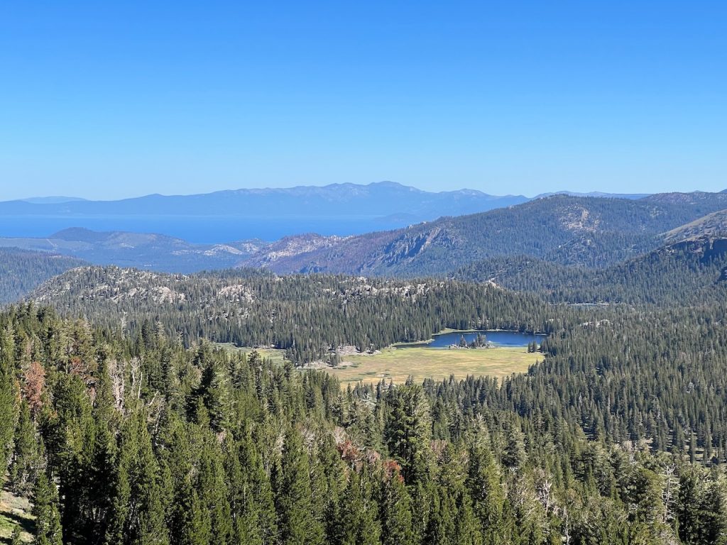 Here is a photo taken from Showers Ridge, looking north to Meiss Lake with Lake Tahoe in the background:
