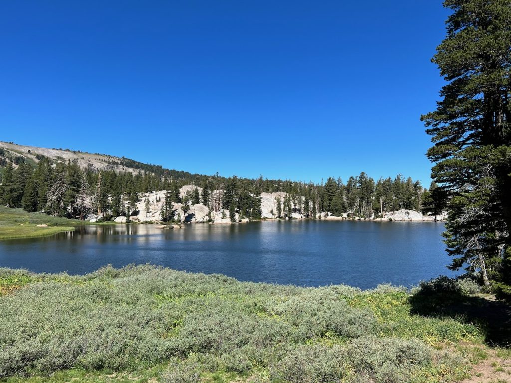 The best way to reach Meiss Lake (c) is to take the Pacific Crest Trail from the trailhead north over the saddle to the junction with the Tahoe Rim Trail, at N38 43.367 W120 00.729, then turn right on the Tahoe Rim Trail for approximately one mile to the point N38 43.862 W120 00.416 (totally unmarked — use a GPS). Then turn northwest and hike cross-country about 0.3 miles to the point N38 44.042 W120 00.704, which is on a rock overlooking the lake — a truly gorgeous spot.