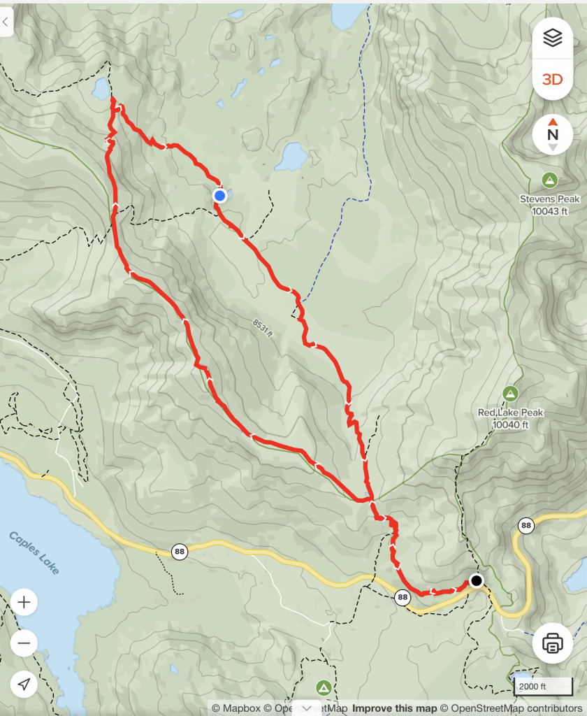 Here is a map of the hike (b) from the Meiss Lake trailhead to the saddle summit, then along Showers Ridge to Showers Lake, then back along the Pacific Crest Trail through Meiss Meadow, and returning to the trailhead, as described above: